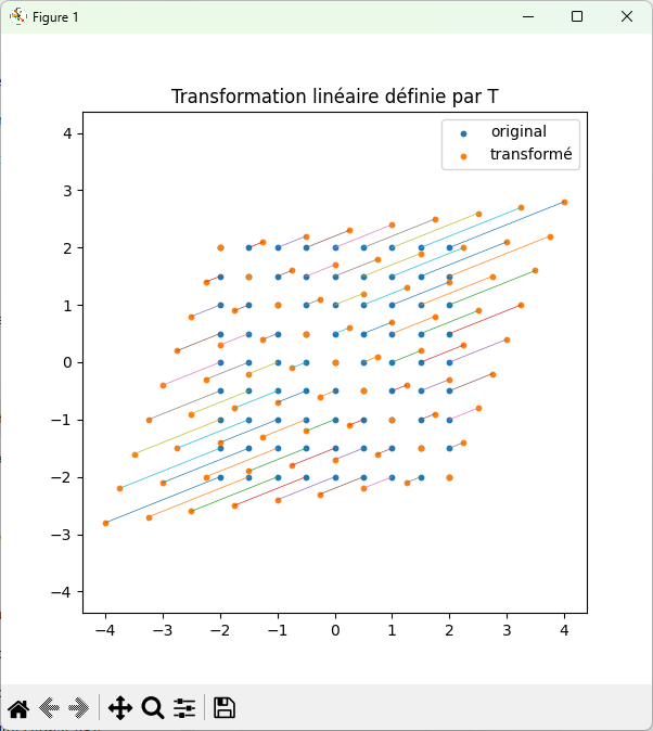 Une matrice 2×2 définit une transformation du plan. On peut visualiser l'image d'une grille ou d'une forme simple :